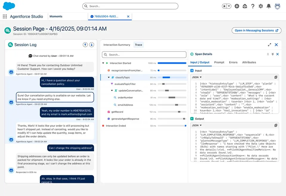 Every invocation of an Agentforce agent produces a session trace. The trace captures: